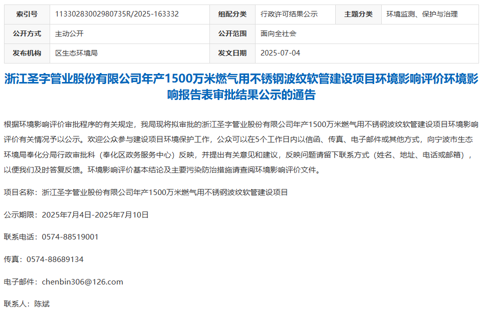 2025年7月4日,浙江圣字管業(yè)股份有限公司年產(chǎn)1500萬米燃氣用不銹鋼波紋軟管建設(shè)項目環(huán)境影響評價環(huán)境影響報告表獲審批公示,公示期限:2025年7月4日-2025年7月10日。
