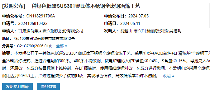 2024年7月5日,甘肅酒鋼集團宏興鋼鐵股份有限公司成功申請一項名為“一種綠色低碳SUS301奧氏體不銹鋼全廢鋼冶煉工藝”專利,申請公布號CN118291706A,申請日期為2024年5月11日。